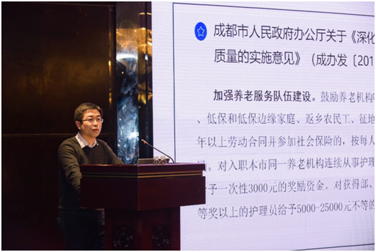 在下午举行的“成都养老人才学院暨高端智库LOGO发布”仪式上,成都市民政局党组成员、副局长张军代表民政系统致辞,对西南交通大学老龄科学研究院在成都养老服务相关领域做出的贡献表示称赞,并对其积极推动组建“成都养老人才学院暨成渝城市群康养医养高端智库”表示大力支持。期间成都市民政局养老服务处处长杨运江就《成民发〔2019〕32 号文》进行了政策解读,旨在推动建立养老服务褒扬机制,争取把养老护理员作为养老服务先进个人评比达标表彰项目,同时宣传贯彻了《养老护理员国家职业技能标准(2019年版)》,旨在打通养老护理员职业晋升通道,加快培养高技能人才,让养老护理员的劳动创造和社会价值在全社会得到尊重和重视。