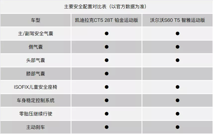 安全配置方面,这两款顶配车型在一番比较之后不论主动安全配置还是被动安全配置S60都占不到半点便宜,并且在被动安全配置上还比CT5差了膝部安全气囊,真是让人有些大跌眼镜。