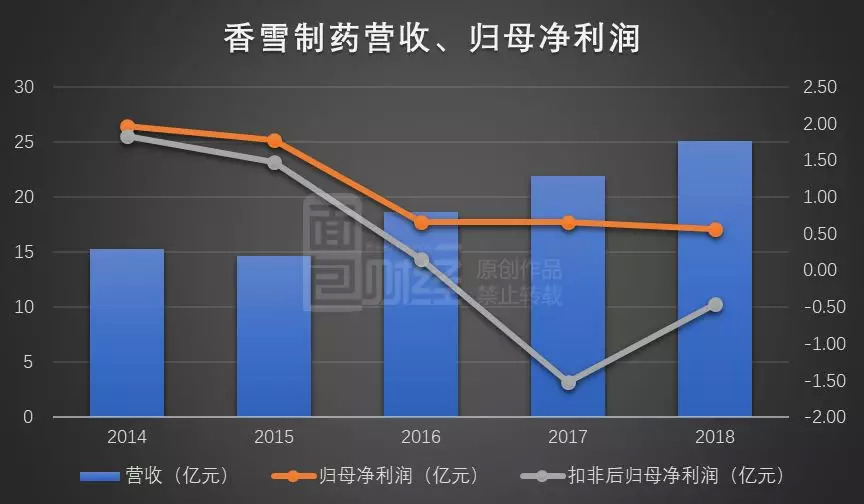 梳理最近五年的财务数据发现,虽然香雪制药的营收仍在增长,由2014年15.24亿上升至2018年25.04亿,但同期的归母净利润持续下滑,由1.97亿减少至0.56亿。如果扣除非经常性损益的影响,香雪制药2017年和2018年均已录得亏损。