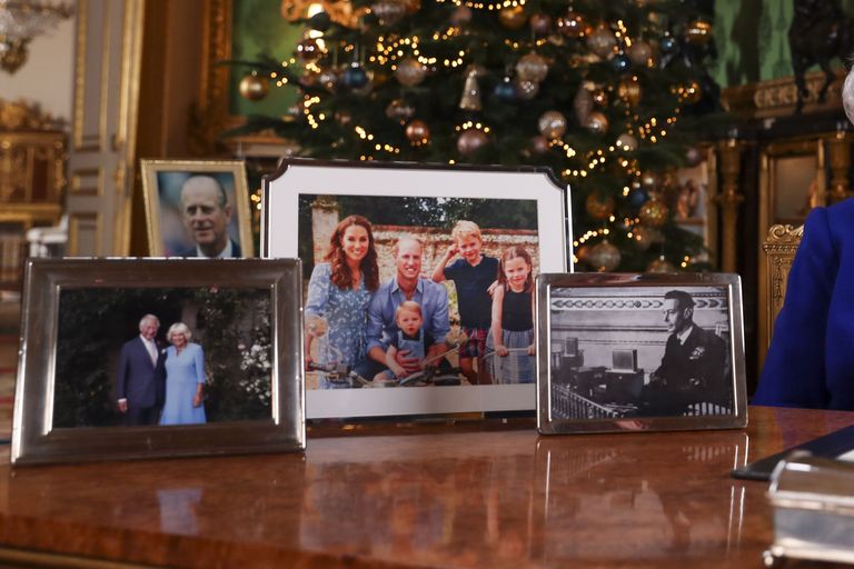 今年,女王的圣诞致辞是在温莎城堡预先拍摄的。在她发表讲话时,她的桌上放着四张重要照片。左侧是查尔斯与卡米拉的合照,后方则是女王的丈夫菲利普的单人照。