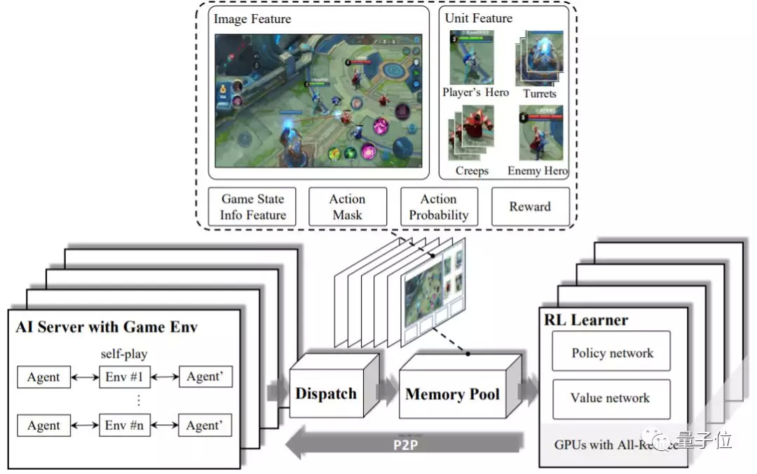 AI的整体架构一共分为4个模块:强化学习学习器(RL Learner)、人工智能服务器(AI Server)、分发模块(Dispatch Module)和记忆池(Memory Pool)。
