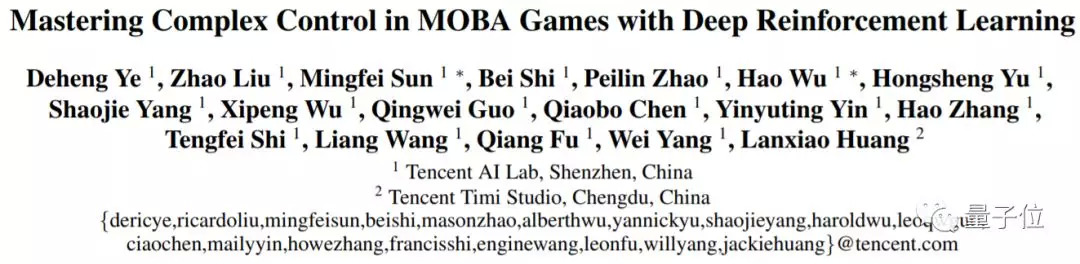与2018年12月份发布的王者荣耀AI论文作者单位相比,这次多了“天美工作室”——王者荣耀的开发团队。