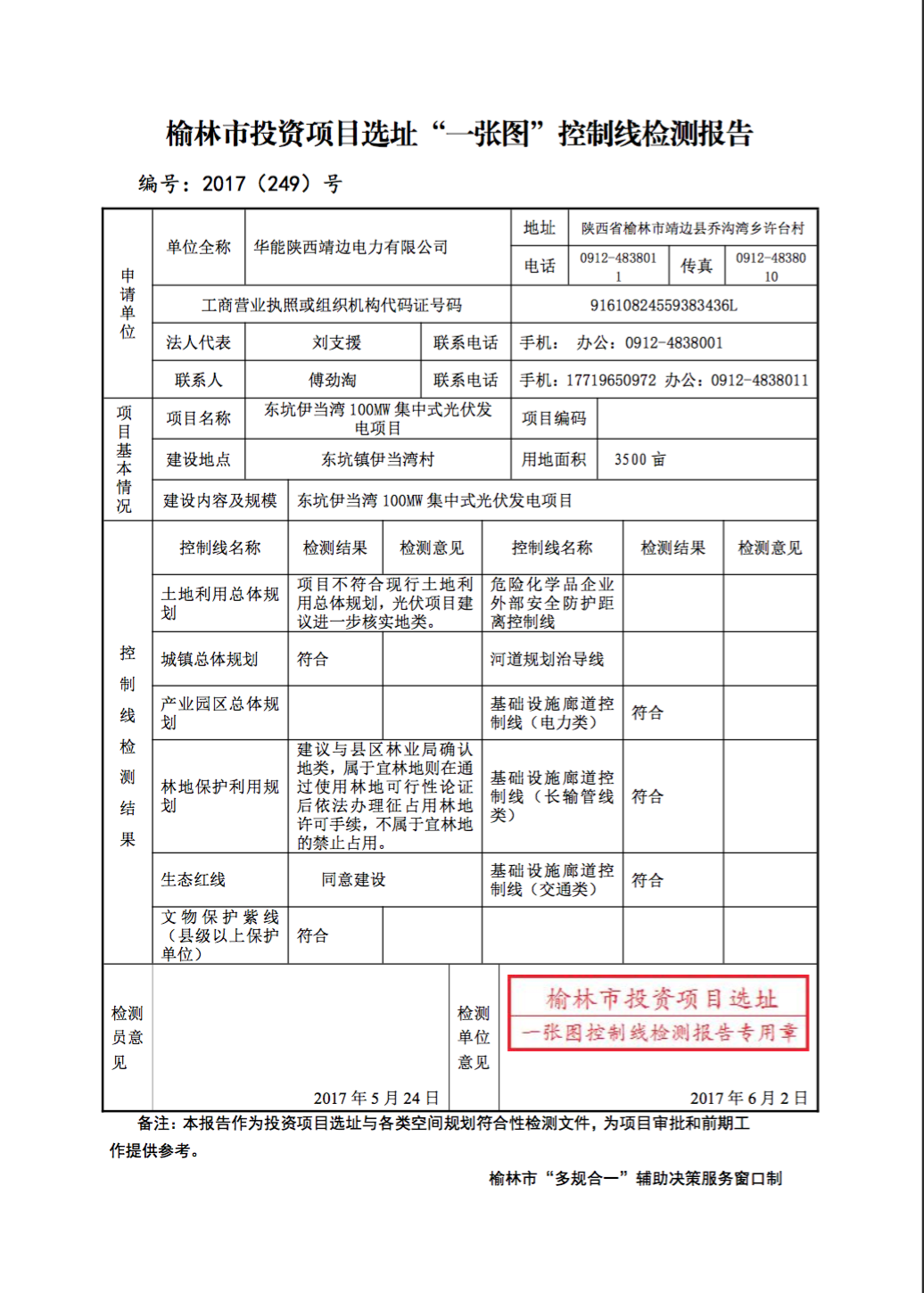 2017年7月,榆林市发改委发布《关于华能陕西靖边电力有限公司东坑伊当湾100兆瓦光伏电站项目备案的通知》(榆政发改发[2017]490号),同意该项目备案。