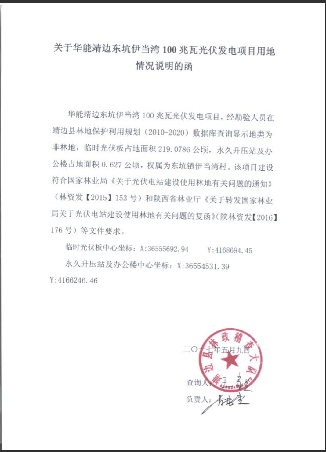 2017年5月,华能靖边光伏项目取得靖边县林政稽查大队关于《华能靖边东坑伊当湾100瓦光伏发电项目用地情况说明的函》则显示,经勘验人员在靖边县林地保护规划(2010-2020)数据库查询,项目地类为非林地,用地权属为东坑镇伊当湾村,符合相关文件要求。