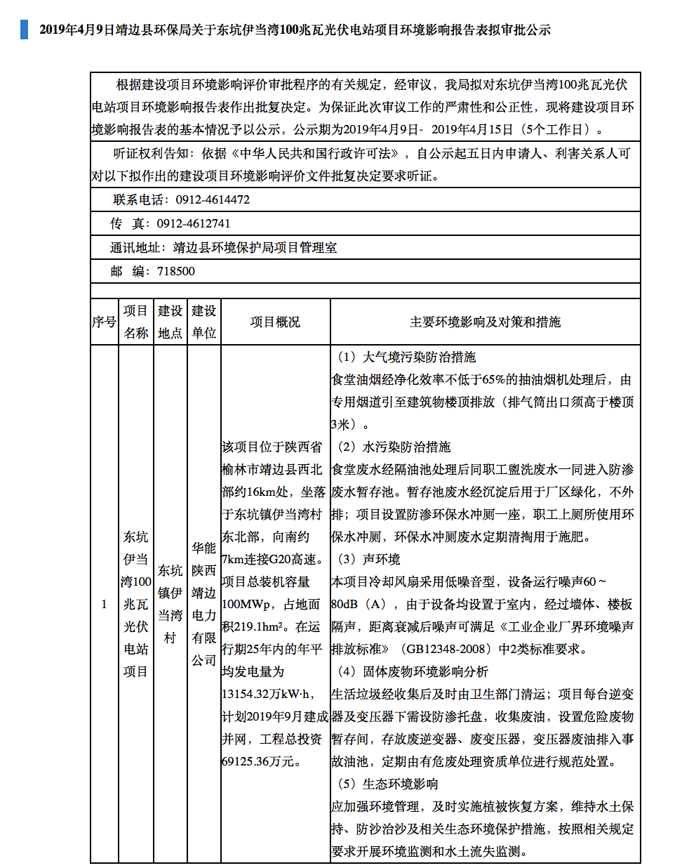 2019年4月,靖边县环境保护局发布《关于东坑伊当湾100兆瓦光伏电站项目环境影响报告表的批复》(靖环批复〔2019〕80号)。