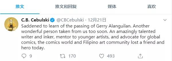 漫威的主编 C.B.Cebulski 也在自己的推特上表达了自己的缅怀。