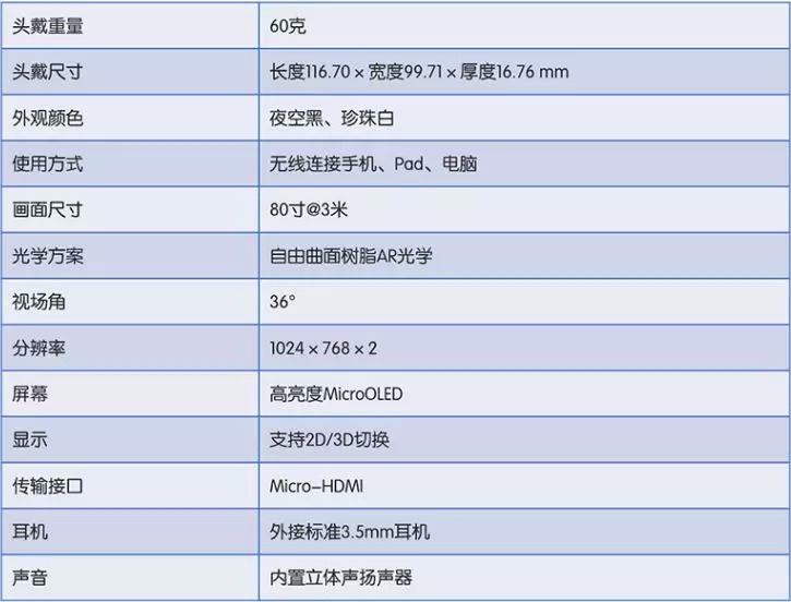 光学部分采用自由曲面方案,内置高亮度MicroOLED屏幕,单眼分辨率为1024*768px,视场角为36°。虚拟界面的观看距离为3米,可实现80寸虚拟大屏效果。