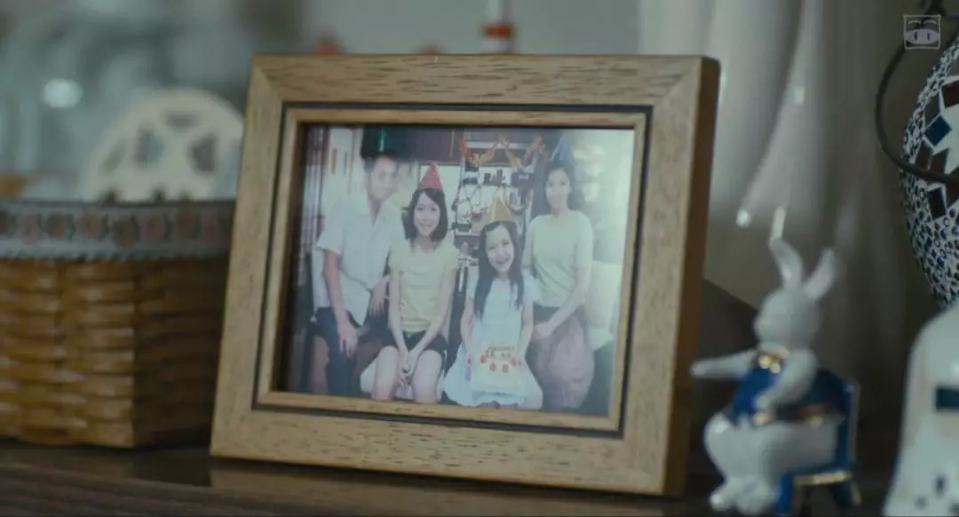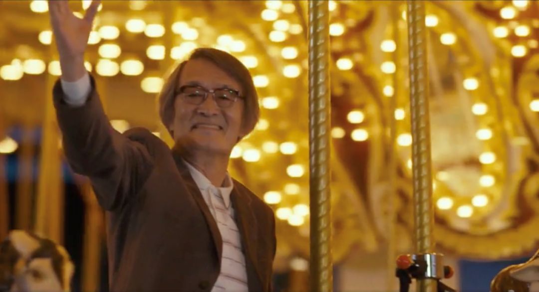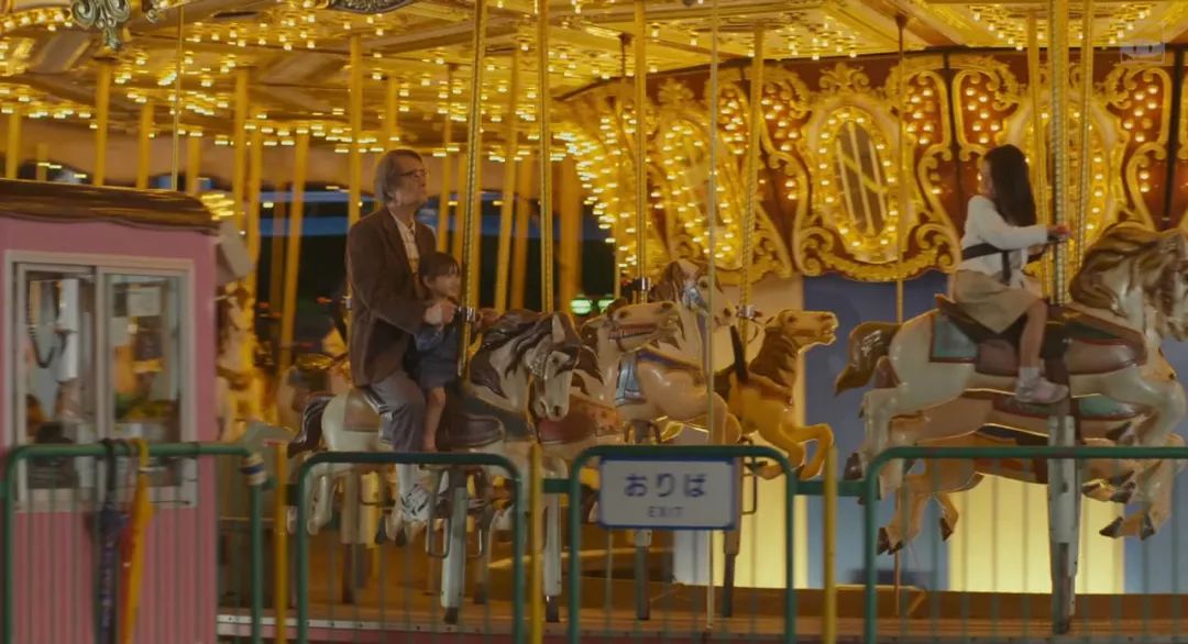 坐在旋转木马上露出天真笑容的父亲,想必是在还原记忆中当年一家四口的温馨。