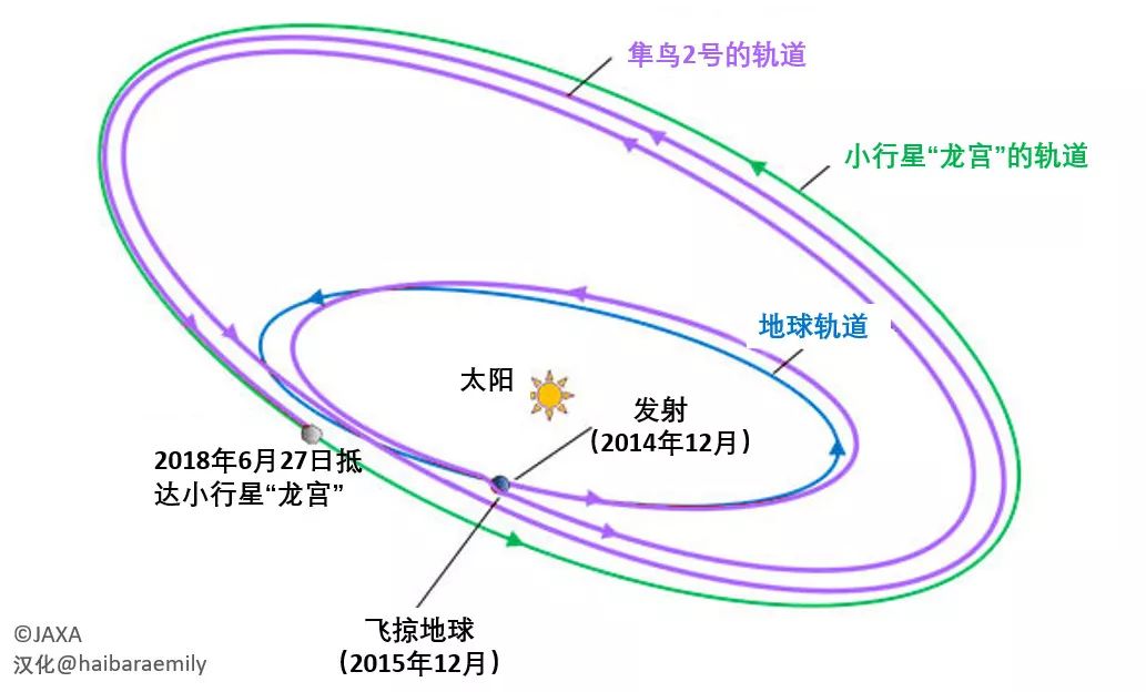 隼鸟2号从地球到小行星龙宫的轨道。改编自:JAXA