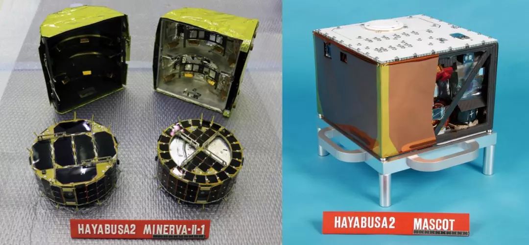 隼鸟2号携带的巡视器MINERVA-II1(左)和着陆器MASCOT(右),已分别于2018年9月21日和10月3日投下。来源:JAXA