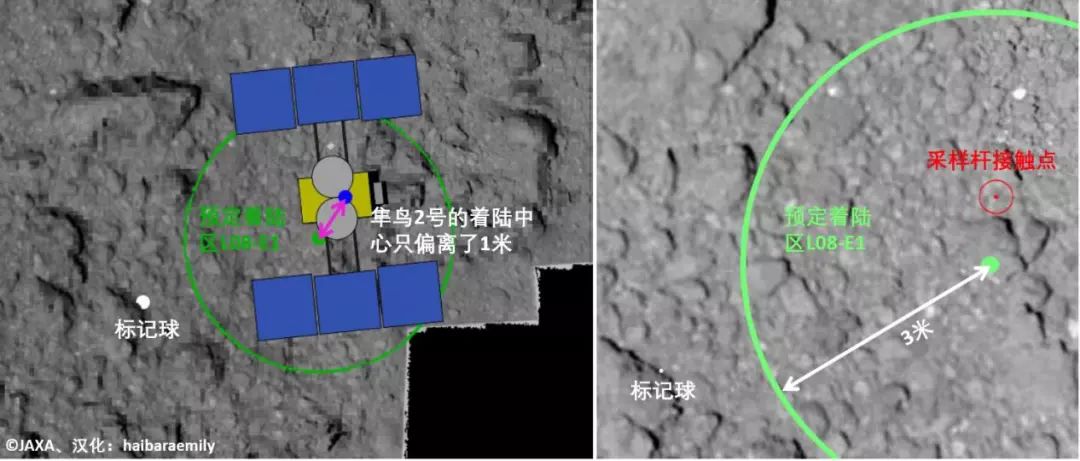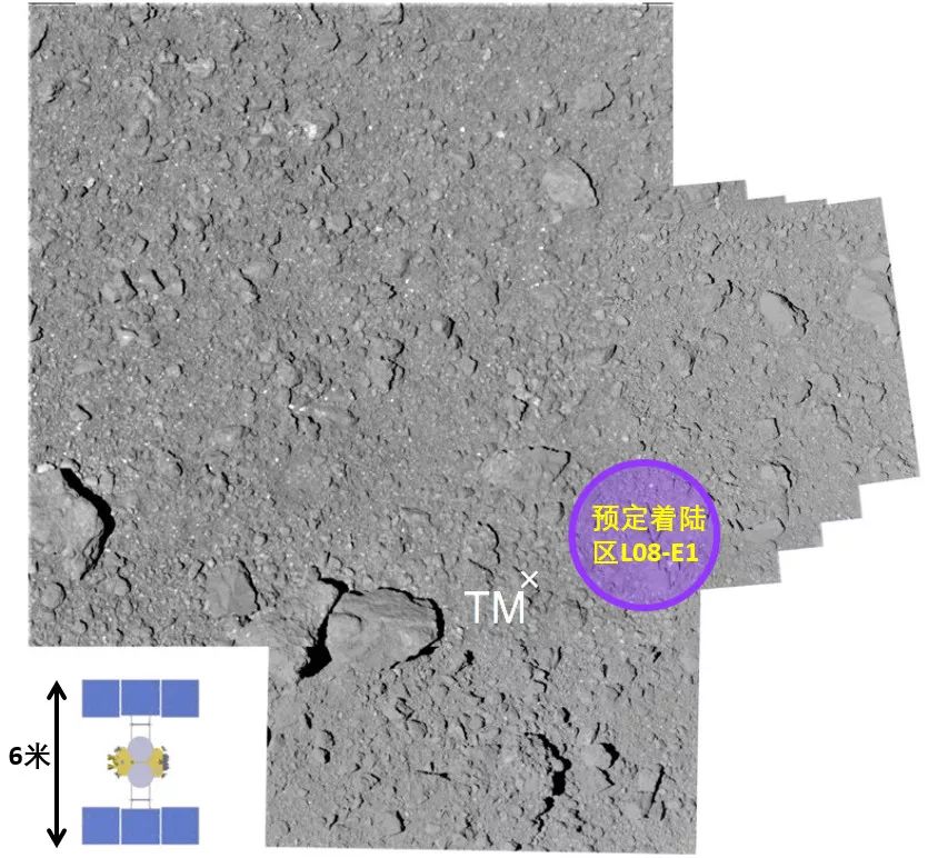 龙宫上已投下的标记球TM位置和预定着陆区L08-E1位置,着陆区范围是一个直径6米的圆形区域。来源:JAXA