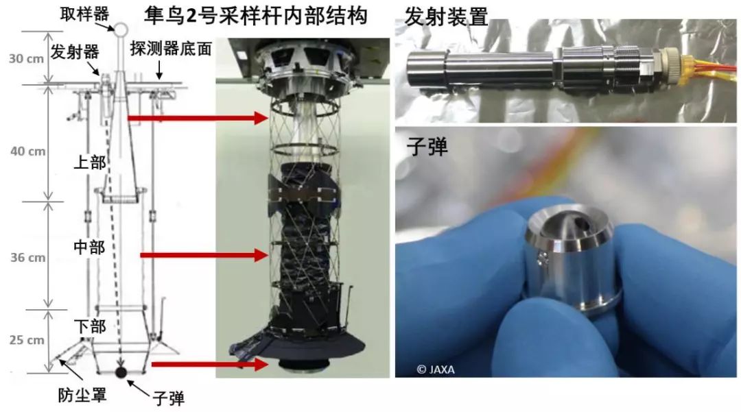 采样杆结构和钽质子弹实物(质量5克,直径8毫米)照片,使用钽质子弹是为了避免采集的样品中混入不可控的污染物。来源:JAXA