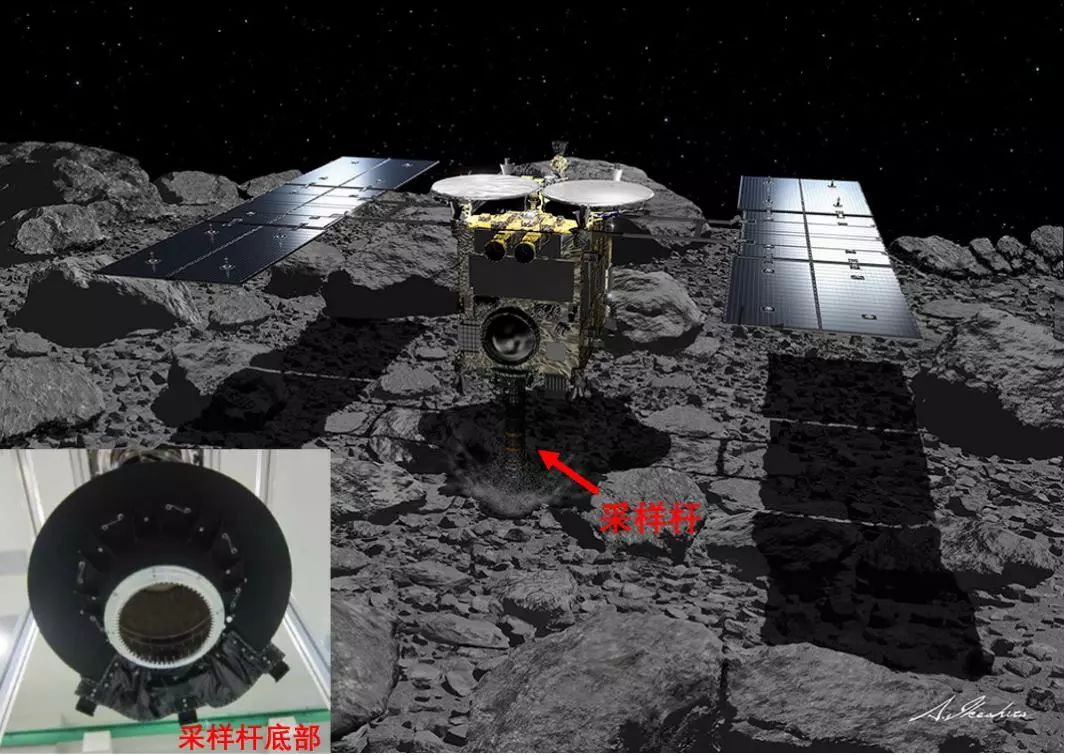 隼鸟2号的采样杆位置和底部视图。来源:JAXA