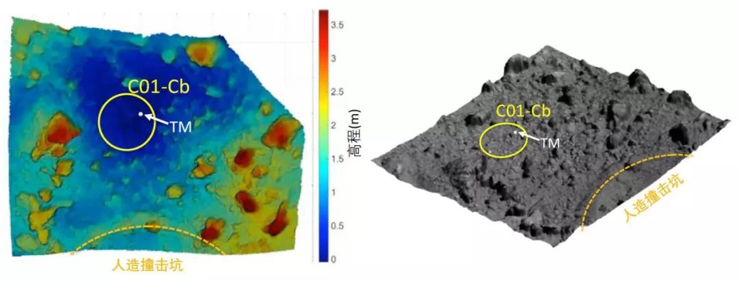 撞出的人造撞击坑直径超过10米,深度约2-3米。值得注意的是新撞出的撞击坑内部呈暗黑色,表明挖出的新鲜物质似乎比表面物质颜色更暗。来源:JAXA、东大等