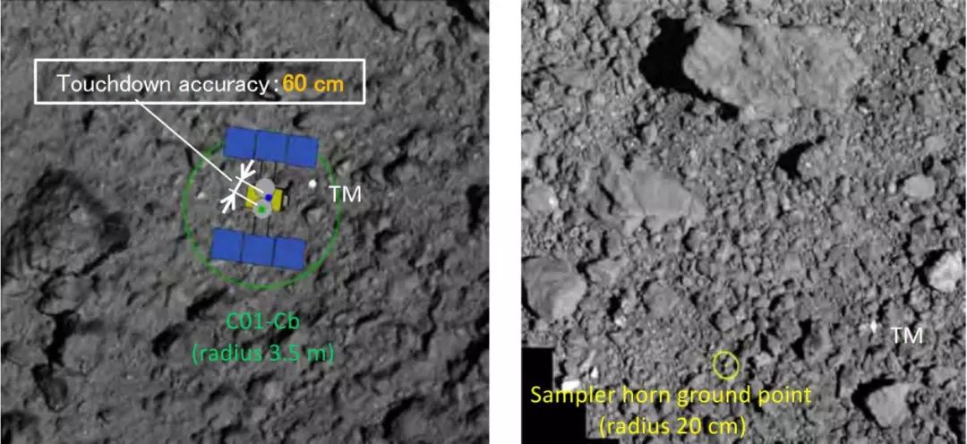 (左)着陆点(蓝点)和计划着陆区C01-Cb的中心(绿点)的位置;(右)采样杆接触点的位置(黄圈)。来源:JAXA