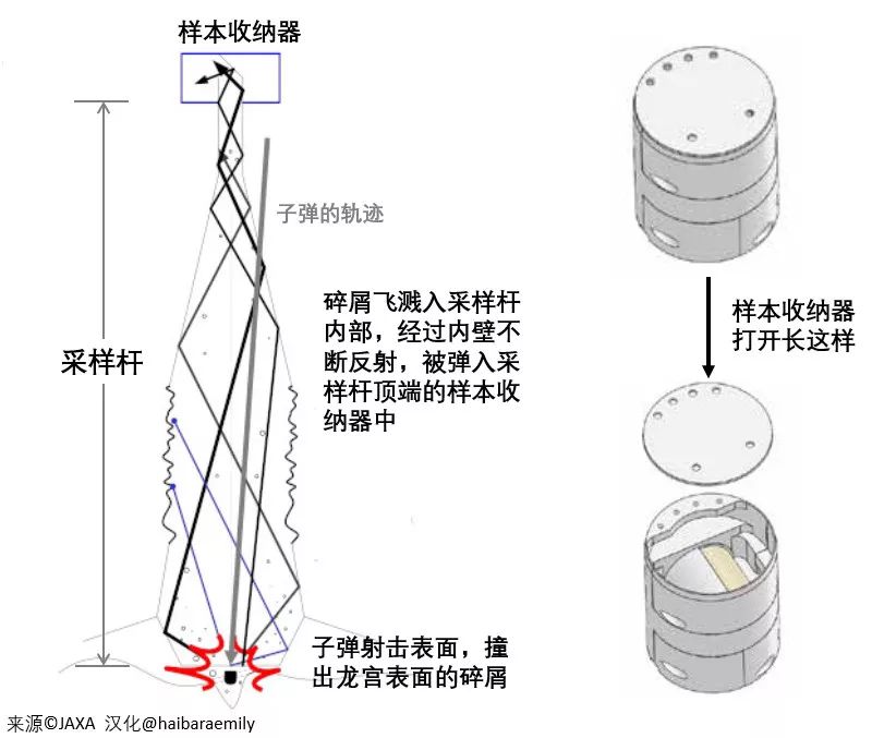 子弹撞出的碎屑被弹射入采样杆中,经过多次弹射被隼鸟2号纳入囊中。