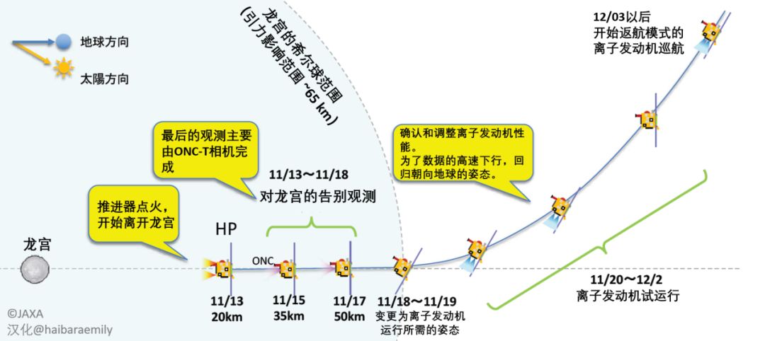 2019年11月13日,隼鸟2号启动RCS推进器,从伴飞位置开始远离小行星龙宫,正式进入“返航模式”。