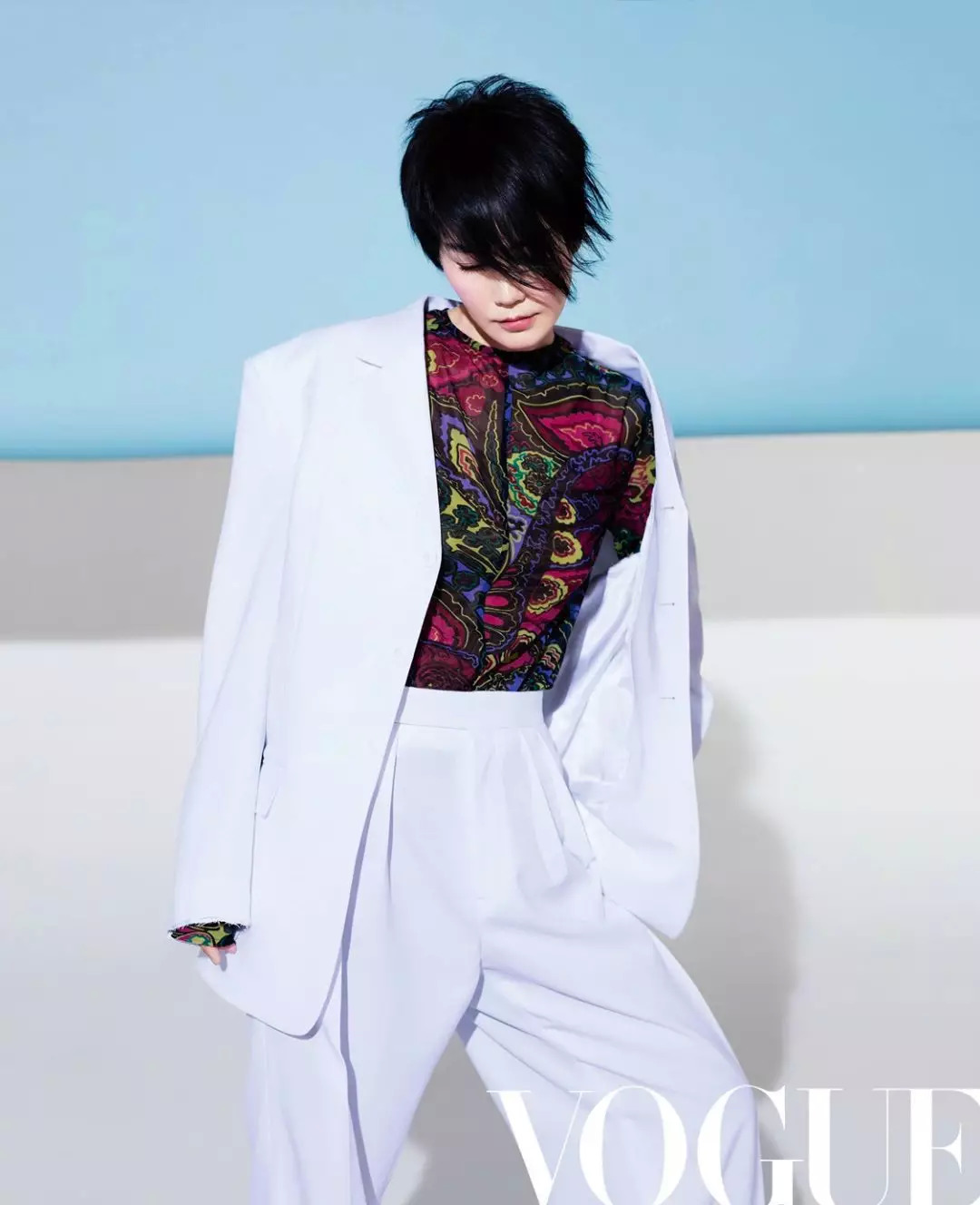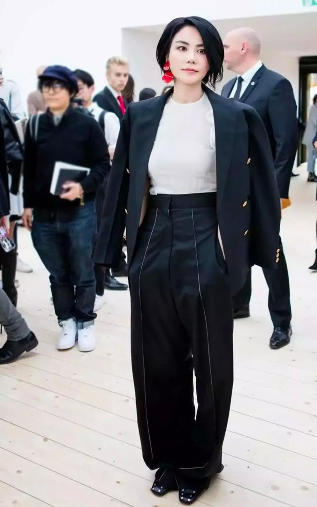 像这种利落得很无情的西装套装,王菲也蛮会穿的。她的办法是,一定要加入别的元素,让规矩的西装变得有风格。这招还挺实用的。