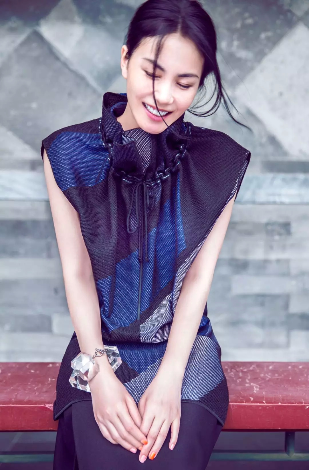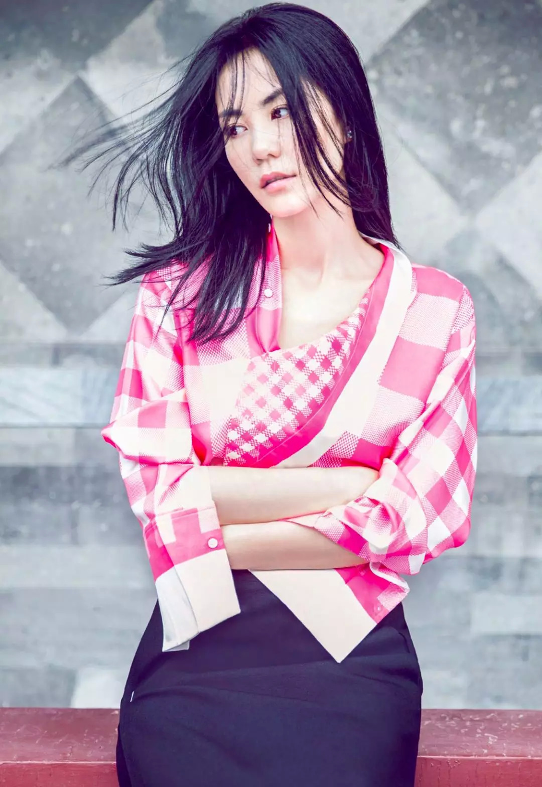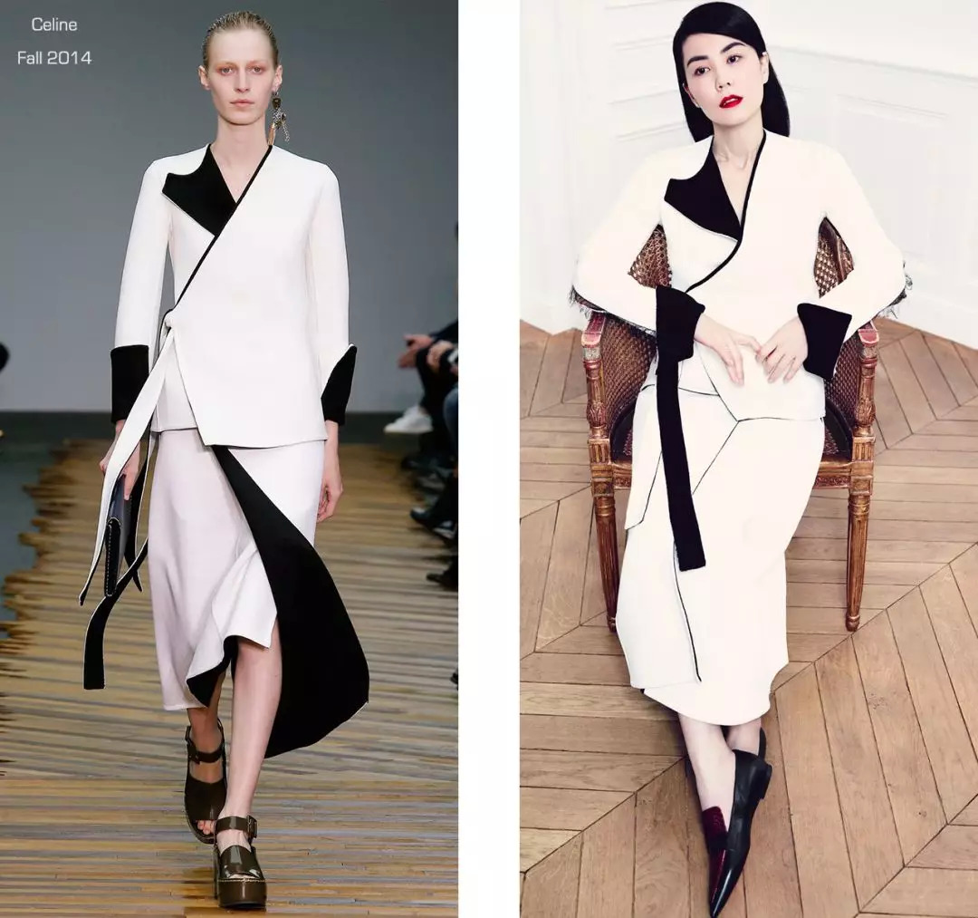 2014年上《ELLE》十月刊,她穿了件粉格子不规则系扣衬衫,下边穿包臀裙,像个时髦的日本女剑客。