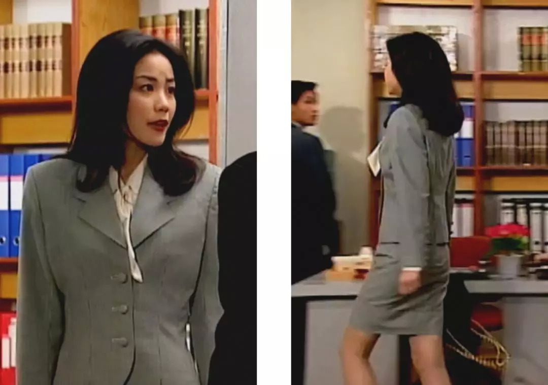 比如她上班最常穿的这套格纹的,有收腰有垫肩,配上领结衬衫,有检察官雷厉风行的一面,同时把腰掐得特别好,挺女人的。