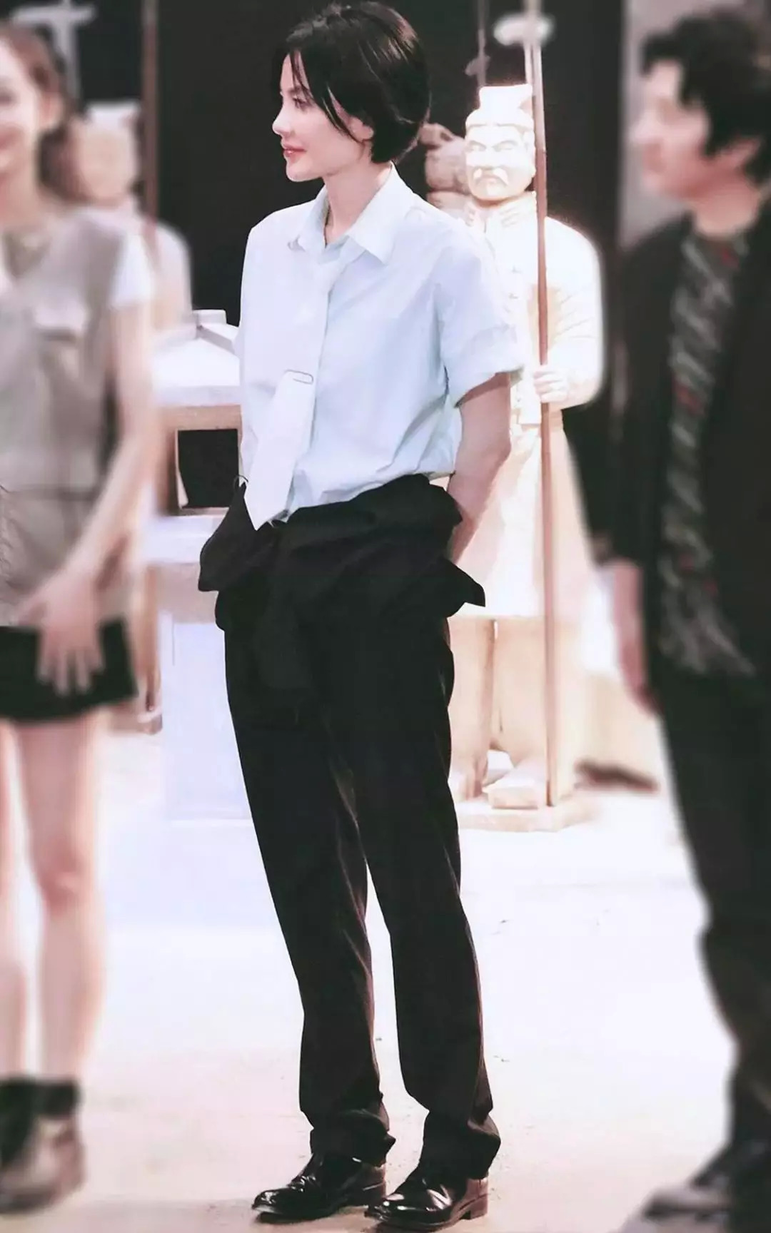 浅绿色的短袖衬衫本身就很帅了,配了条系腰西装裤,像把西装脱下来系腰上一样,迈着剪刀腿,我弯了。