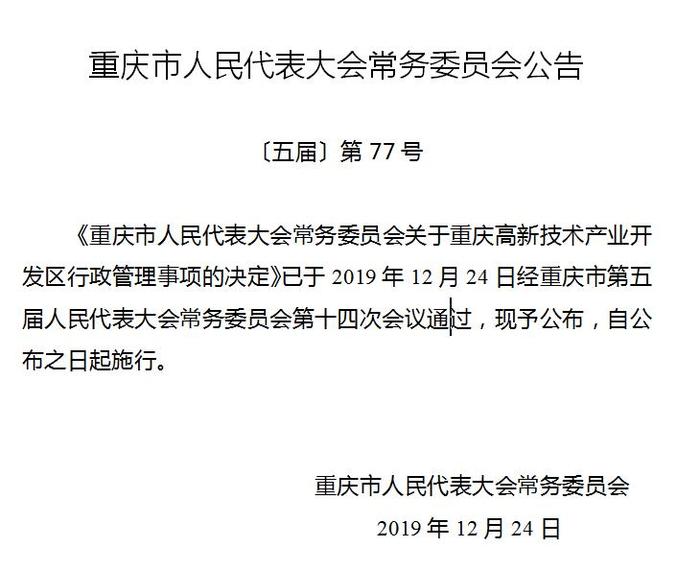 12月24日,重庆市第五届人民代表大会常务委员会第十四会议通过了关于重庆高新技术产业开发区行政管理事项的决定。明确了高新区主要职责、管理范围等。