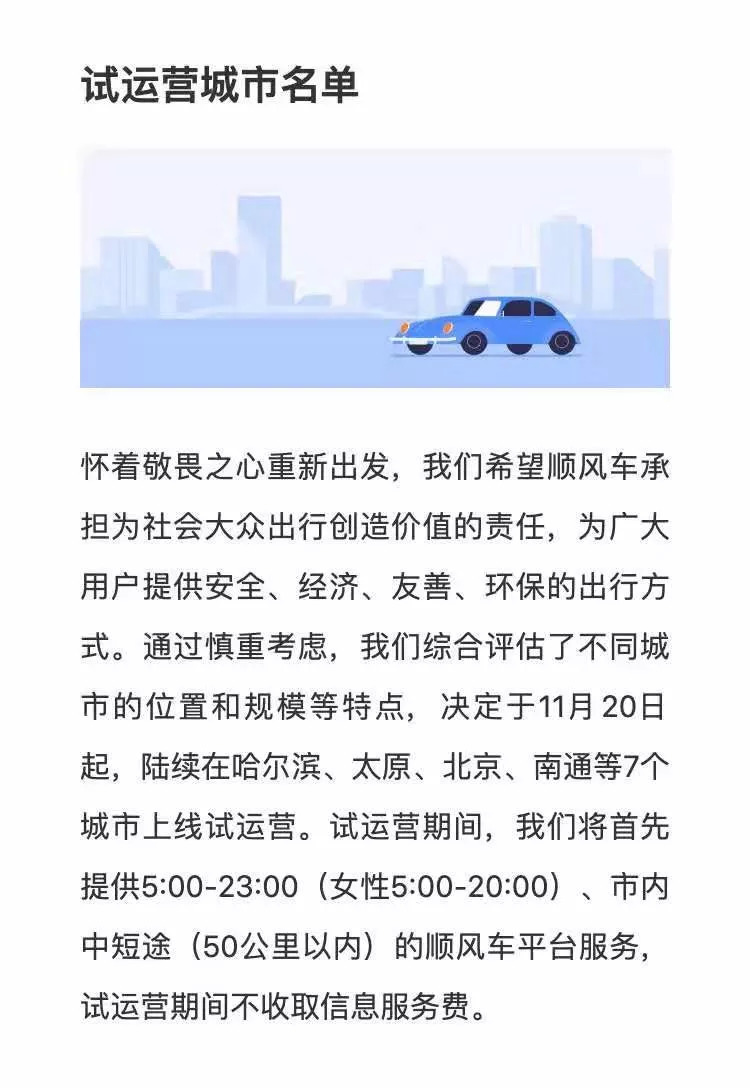 按照此前滴滴顺风车公布的消息,12月23日9:00,滴滴顺风车将于北京、武汉、佛山、南昌、长沙5个城市上线试运营。更早的11月20日,滴滴顺风车已在哈尔滨、太原、常州三地上线。