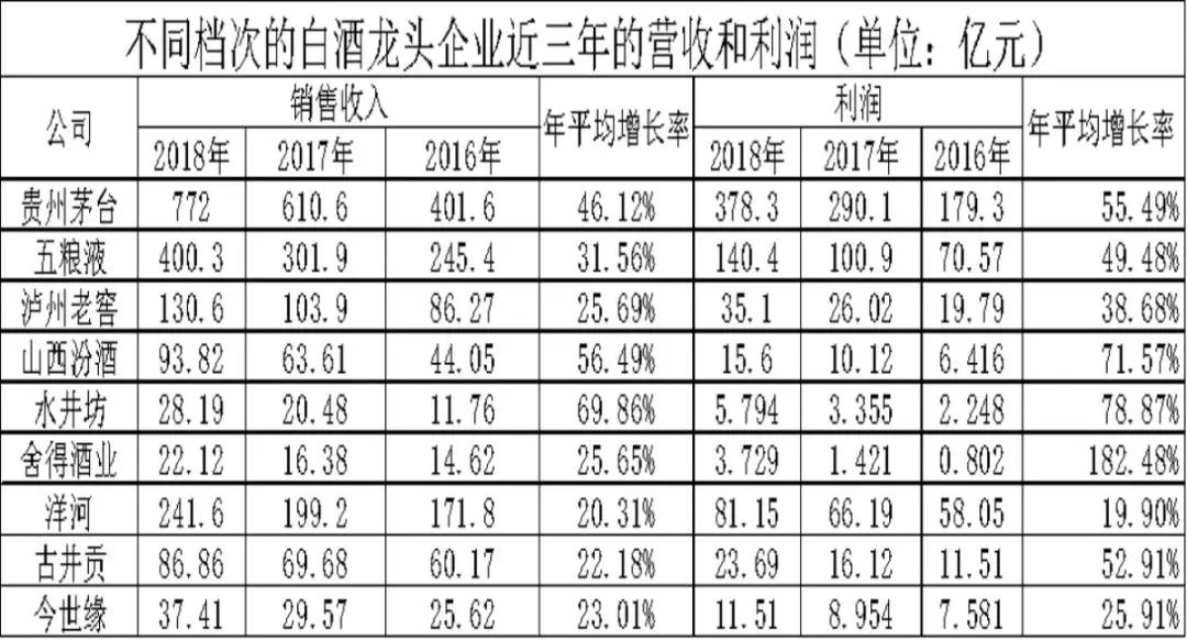 以上数据统计了我们给出的三个档次中的前三大龙头企业在近三年内的销售收入和利润增长情况,整体来看所有的企业营收都保持在20%以上的水平,利润除了洋河(19.90%)以外,也都保持在20%以上的增长水平,在行业整体去产能过程中,龙头企业保持了扩张,另外需要注意到,每一个企业的平均利润增长率都高于同期的营收增长率,这也反映了在这一过程中龙头企业的议价能力在提升,利润率处于上涨状态。