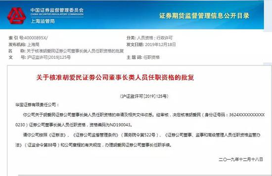 而在12月18日,上海证监局发布的一则致华宝证券的批复通知显示,决定核准胡爱民证券公司董事长类人员任职资格。这也意味着,华宝证券的新任董事长胡爱民将正式履职。