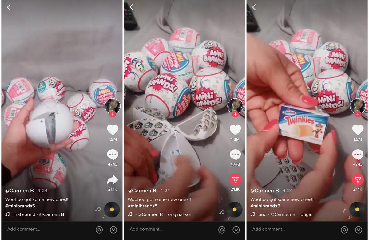 这款盲盒的外形是一个球形胶囊,里面装有五种不同的“迷你产品”,包括多芬、Twinkies、立顿等品牌,但消费者在购买之前并不知道会拆出来具体是哪一款产品。于是,能够满足好奇心的盲盒开箱视频成为了TikTok上的热门话题,标签#MiniBrands的观看次数超过3.93亿次,也带火了这款产品的线上线下的销售。
