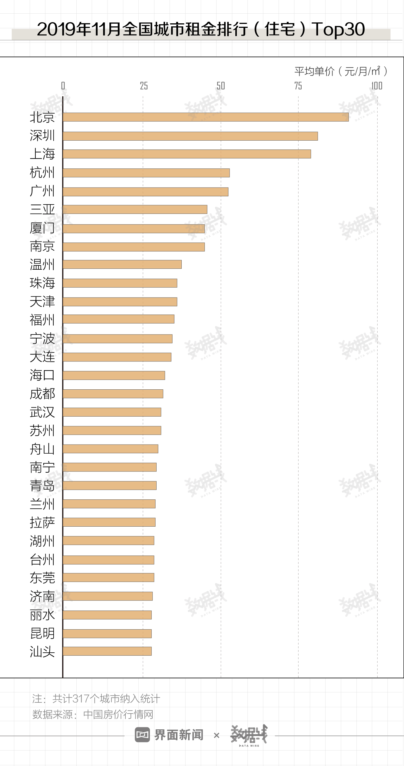 从租金水平来看,11月,月租金(住宅)最高的北京和深圳,分别达到91.03元/月/㎡和81.06元/月/㎡。