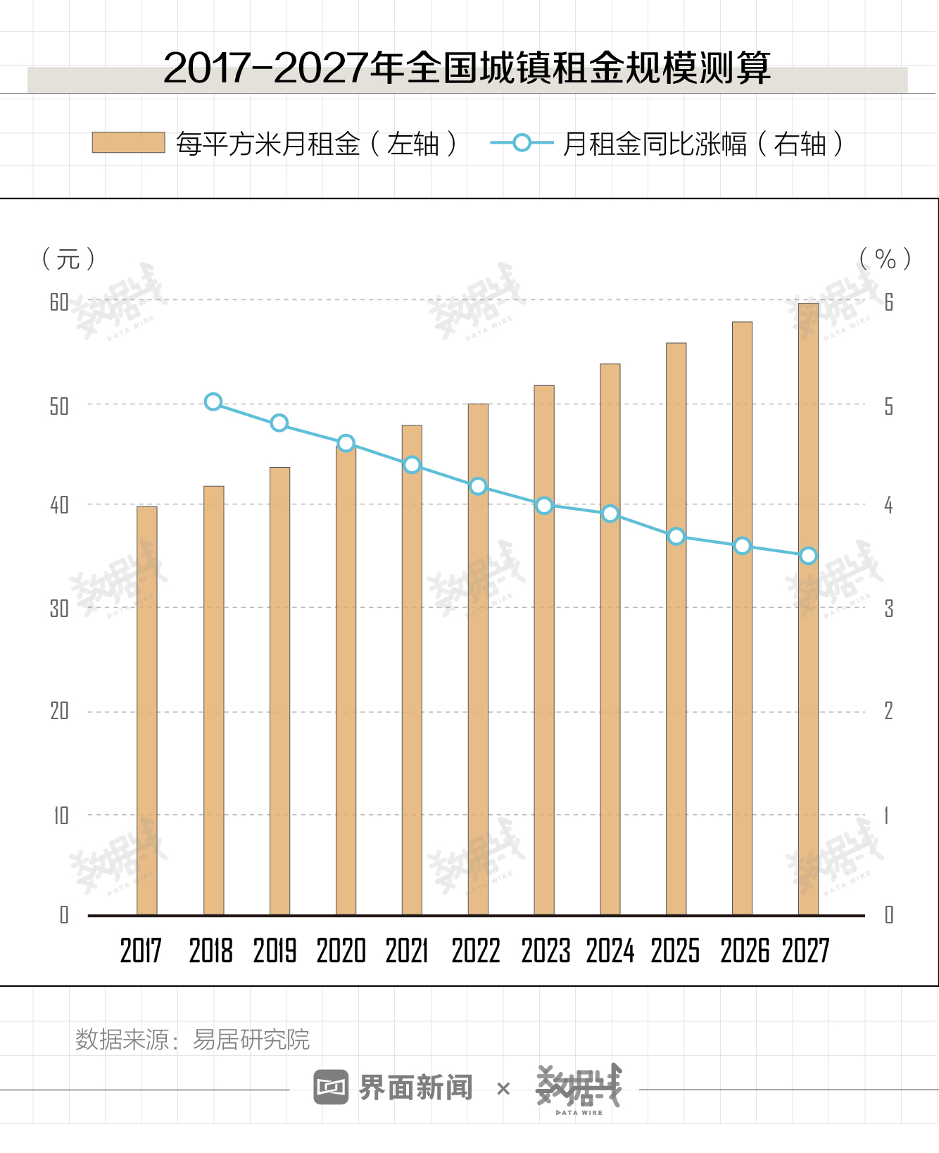 2020年租金走势会如何?2017年12月,易居房地产研究院曾测算,2020年,全国城镇每平方米月租金将达到46元,同比涨幅4.6%,继续维持自2018年起的小幅回落趋势。