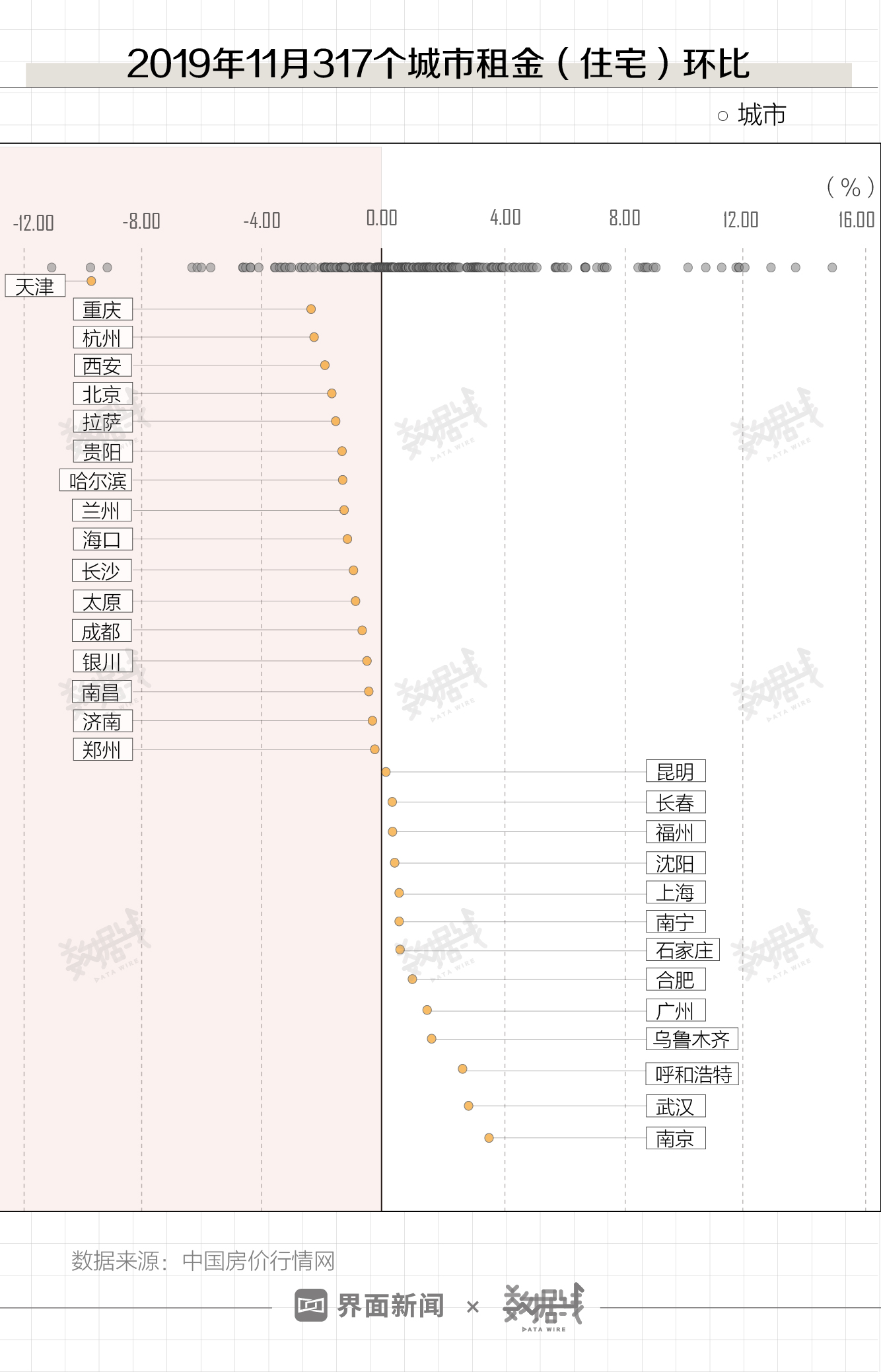 据中国房价行情网,2019年11月,在纳入统计的317个城市中,共计117个城市租金(住宅)环比下降。这其中既包含杭州、西安等14个省会(自治区首府)城市,也包含天津、重庆和北京3个直辖市。
