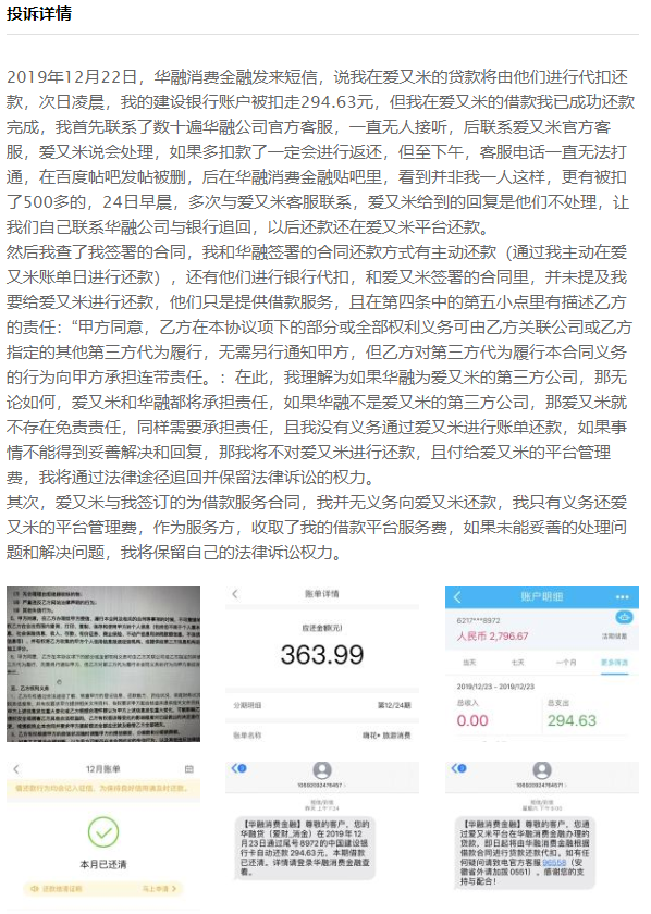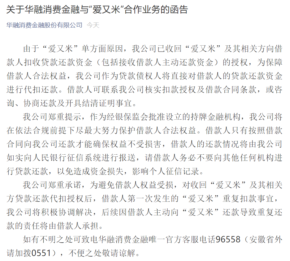 函告同时提及,为避免借款人权益受损,对收回“爱又米”及其相关方贷款还款代扣授权后,借款人第一次发生的“爱又米”重复扣款事宜,华融消费金融将积极协调解决,后续因借款人主动向“爱又米”还款导致重复还款的责任将由借款人承担。