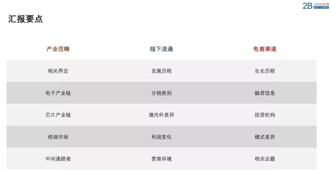 今天汇报的主要内容是围绕上述3个部分、15个要点进行展开:第一部分,主要是从宏观层面上去介绍今天我们所讨论的元器件所属产业的上、下游发展情况以及中间通路商的功能,通过这些大家可以迅速的了解中国整个半导体产业目前发展的情况以及在芯片流通领域,中间商所扮演了哪些角色等问题;第二部分、第三部分分别从线下流通、电商渠道两个角度来阐述目前国内元器件分销行业的“危与机”。