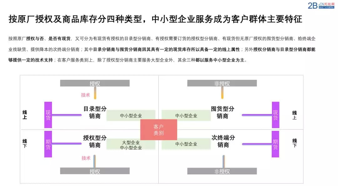 第二种分类是按照是否有原厂授权,分为授权分销商和独立分销商两种基本类型,按照服务客户群体的不同,还有专门服务中小型企业的目录型分销商。但如今的市场,各种分销商之间的服务界限正在模糊,混合型分销商正在出现。根据业内相关人士按照是否授权、是否有库存,分为如上图所示的四种类型:有现货有授权的目录型分销商、有授权需要订货的授权型分销商、有现货但无原厂授权的囤货型分销商、给终端企业找缺货、提供降本的次终端分销商,其中目录分销商与囤货分销商因其具有一定的现货库存所以具备一定的线上属性;另外授权分销商与目录型分销商都能够提供一定的技术支持;在客户服务类别上,除了授权型分销商主要服务大型企业外,其余三种都以服务中小型企业为主。