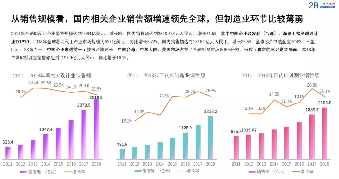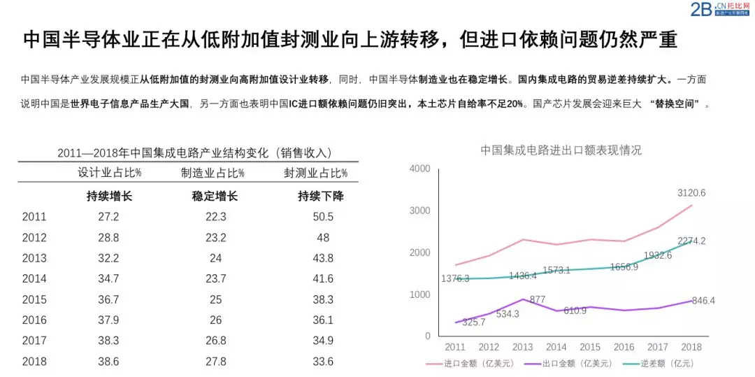 我们从左边的图表可以看出中国半导体企业近几年来正在努力向半导体上游具有高附加值的设计及制造业转移。比如在设计业销售收入占比从2011年的27.2%持续增长到2018年的38.6%的销售占比,与之相反的是,封测业出现了持续的下降,这一点与伴随国内人工成本增高,低附加值的封测业向东南亚迁移有关,处在中间位置的半导体制造业也表现出了稳定增长的态势。