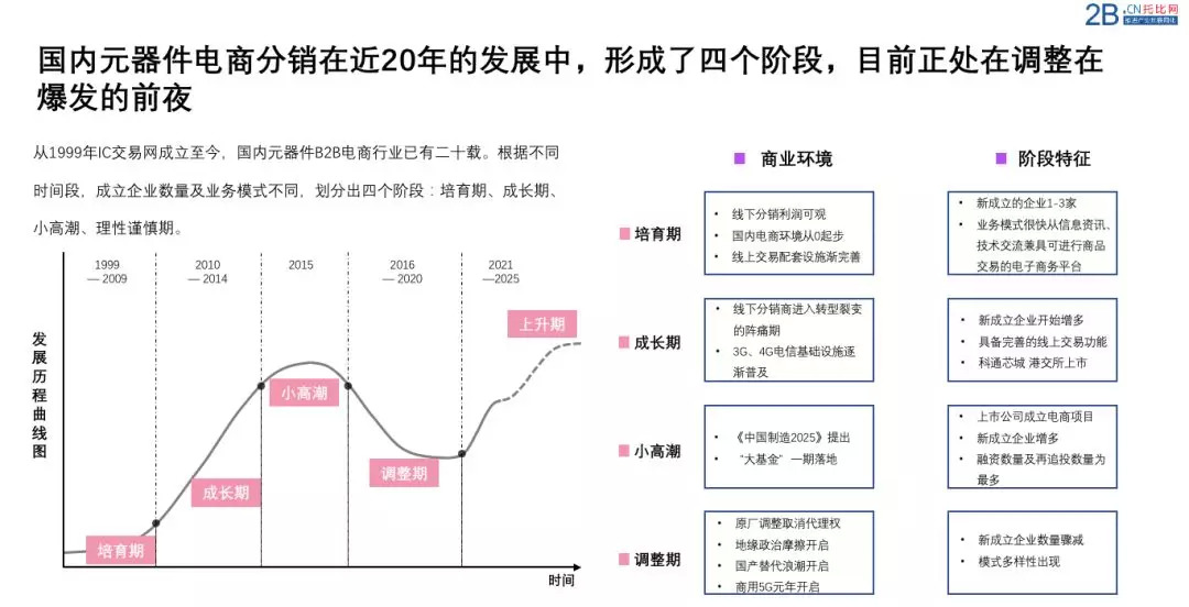 从发展历程上看,国内元器件B2B的发展是从1999年IC交易网的成立开始算起,期间经历了培育期、成长期、小高潮、以及如今的理性谨慎期这几个阶段。其中在每个阶段都会有不同的发展特征。在培育期的十年尽管线上模式发展缓慢,但毕竟开拓了一条新的分销通路,打破了原有只以线下经营的独有模式,在成长期阶段线上营收占比开始增多,传统的线下分销商迎来了第一波转型的阵痛期。国内也迎来了第一批纯线上交易平台,科通芯城也在这个阶段上市。2015年元器件B2B迎来了小高潮,无论是从融资数量还是新成立的企业都为最多,但进入2016年后,新成立企业数量骤减,当然这并不认为,国内元器件B2B电商模式已经到了衰退期,而是认为以电子商务形式为载体来融合元器件,进行B2B分销模式并没有在3G、4G时代大规模崛起,而会从商用开始的5G时代到来,叠加这20年的发展、以及目前电子商务环境的愈发成熟,国产替代的起势,等各种要素,会处在谨慎理性的发展期。预测,2021年,国内元器件B2B行业或会迎来新的小高潮。