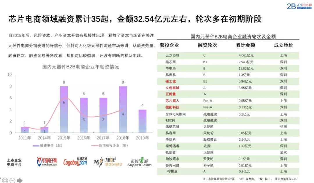 另外我们在从资本的维度去看,截止2019年12月上旬,除去上市公司旗下的四家元器件电商平台:华强电子网、科通芯城、力源芯城、芯智云城,国内一级市场已有19家芯片分销B2B企业对外披露融资数据,共计发生35起,总累计融资金额32.54亿元左右。其中本年度有硬之城、立创商城、芯片超人、捷配科技、正能量等五家企业获得融资。从轮次上来看,多集中在初期阶段。整体来讲,针对万亿级元器件流通市场,融资情况相对还是比较薄弱,还没有明晰的梯队出现。