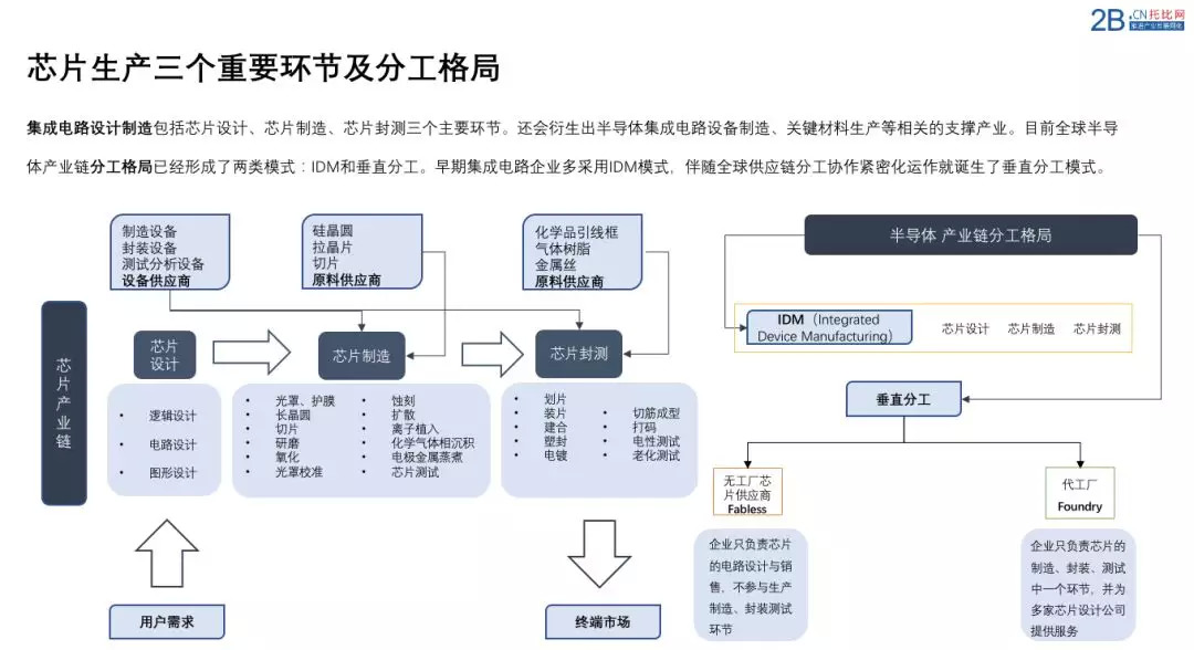 这是一张关于上游芯片生产领域的全产业链及分工模式图。目前国内本土企业在芯片设计、芯片制造、芯片封测领域的表现情况是如何的呢?因为它直接关系下游流通领域的变化情况。
