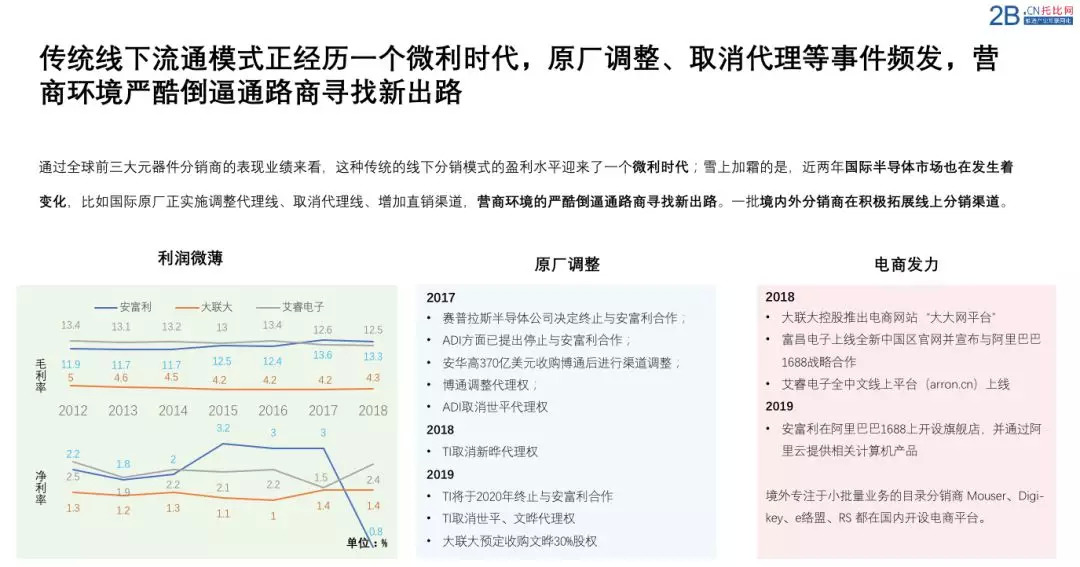 总体而言,无论是那种分类方法,如今的半导体通路商已不单单是商品交易、信息撮合的经营商,而是会承载更多的商品流通职能。而且面对整个半导体行业正步入“低谷”、贸易战意外“冲击”、碎片化的物联网市场“崛起”,上述无论哪种角色都有机会融入其中,用特色服务来打造差异化的竞争壁垒。