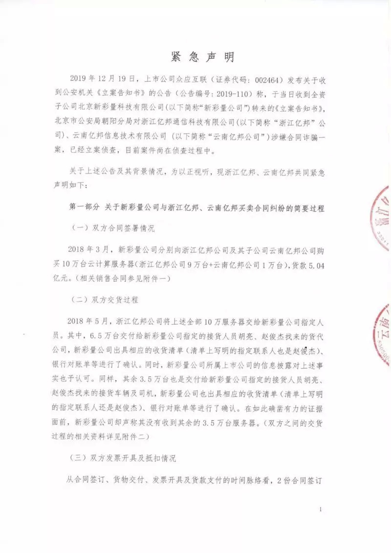12月20号,众应互联发布公告称,浙江亿邦、云南亿邦与新彩量科技(众应互联旗下子公司)的买卖合同纠纷涉嫌合同诈骗,众应互联宣称的“合同诈骗”主要围绕的是:其旗下子公司新彩量科技曾向浙江亿邦、云南亿邦订购了10万台矿机,但是有3.5万台矿机亿邦方面没能交货。同时表示北京警方已经对亿邦方面立案侦查。