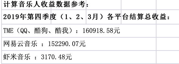 从上图可以看出,太声文化一个季度通过歌曲播放量获得的总收益为316379.13元。但是,音乐先声也发现报表中非常不严谨,比如2019年第四季度(1、2、3月)这个信息明显出现了错误。到底是工作人员单纯的粗心,还是在修改数据中的遗漏,我们不得而知。