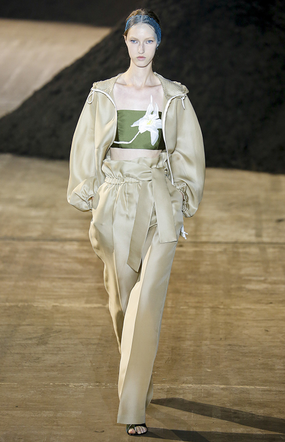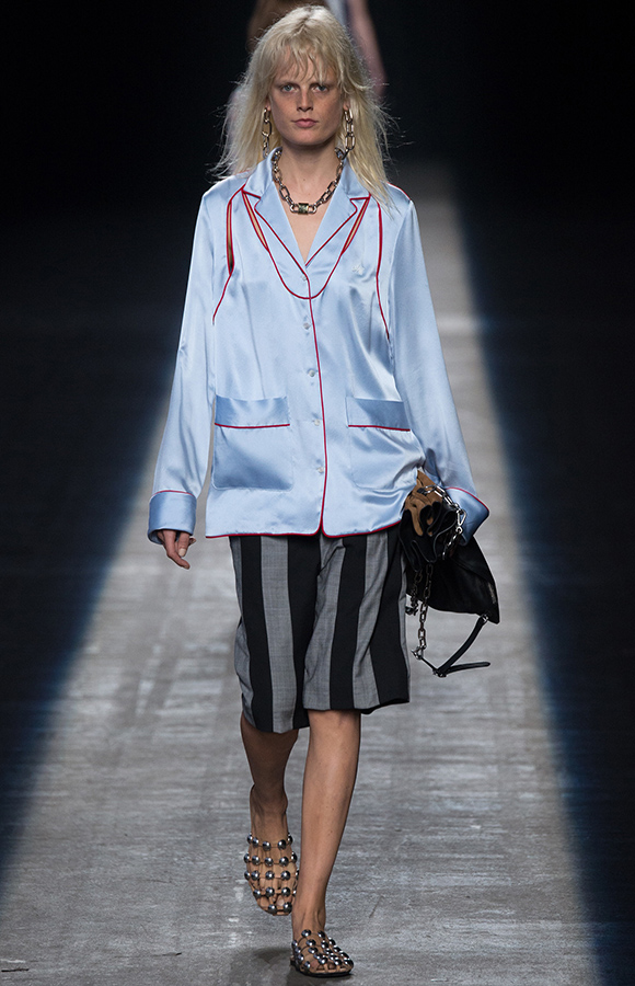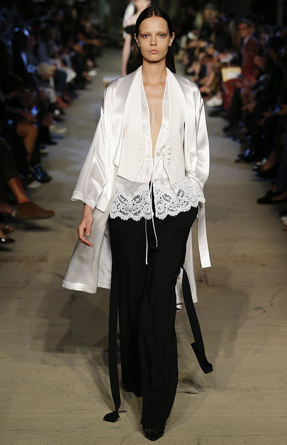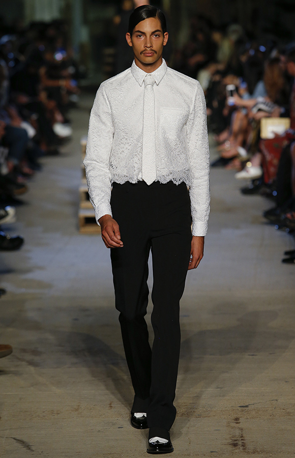 早在纪梵希把原定于9月11日春夏发布会开放了一部分名额给公众的消息借Instagram昭之天下,搞得一副很意味深长的样子后,人们对此秀的期待值便莫名上涨。然而在发布会当天,最先出场的竟是以白蕾丝缎面吊带搭配阔腿裤的模特,乍一看好似小姑娘偷穿母亲的内衣。并且这种窗帘式下摆的蕾丝,还毫无避讳地贯穿了整个系列的款式之多半。