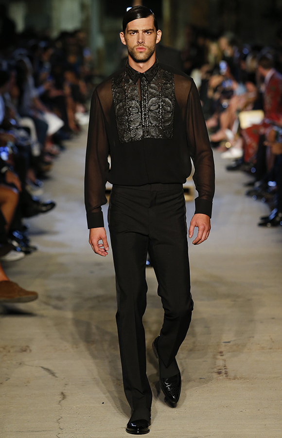 从男士上装的肩部透视到衬衫的浮雕蕾丝——纪梵希这回连男装都不能幸免。不过能称被为全场压轴担当的,则是这一袭华丽的麻将凉席: