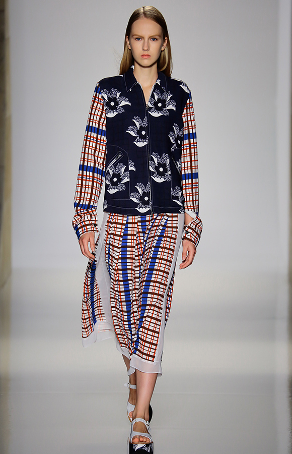 事实上,贝嫂自己的品牌Victoria Beckham一贯主推的是搭配细高跟的沙漏裙,而这次的秀更像是一场转型,用看似随和了许多的格纹和拼贴,加之简洁的剪裁,把女人的自信展露出来。