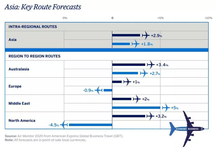 在经济增速放缓和中美贸易战的背景下,亚洲区域内的联系将进一步加强,尤其是通往印度、马来西亚和印尼的航线。由中国出发飞往亚洲目的地的商务舱票价预计将上涨1.3%。