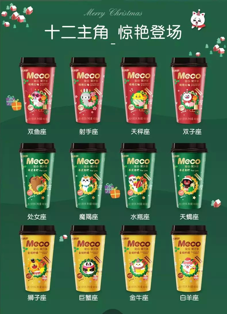 作为知名茶饮品牌香飘飘旗下新晋热销产品,Meco果汁茶将其定位于“新派茶饮”,自2017年问世以来就具备时尚、年轻、个性化的品牌特征。基于此特性,今年圣诞节Meco联合了同道大叔十二星座IP推出圣诞限定版果汁茶。