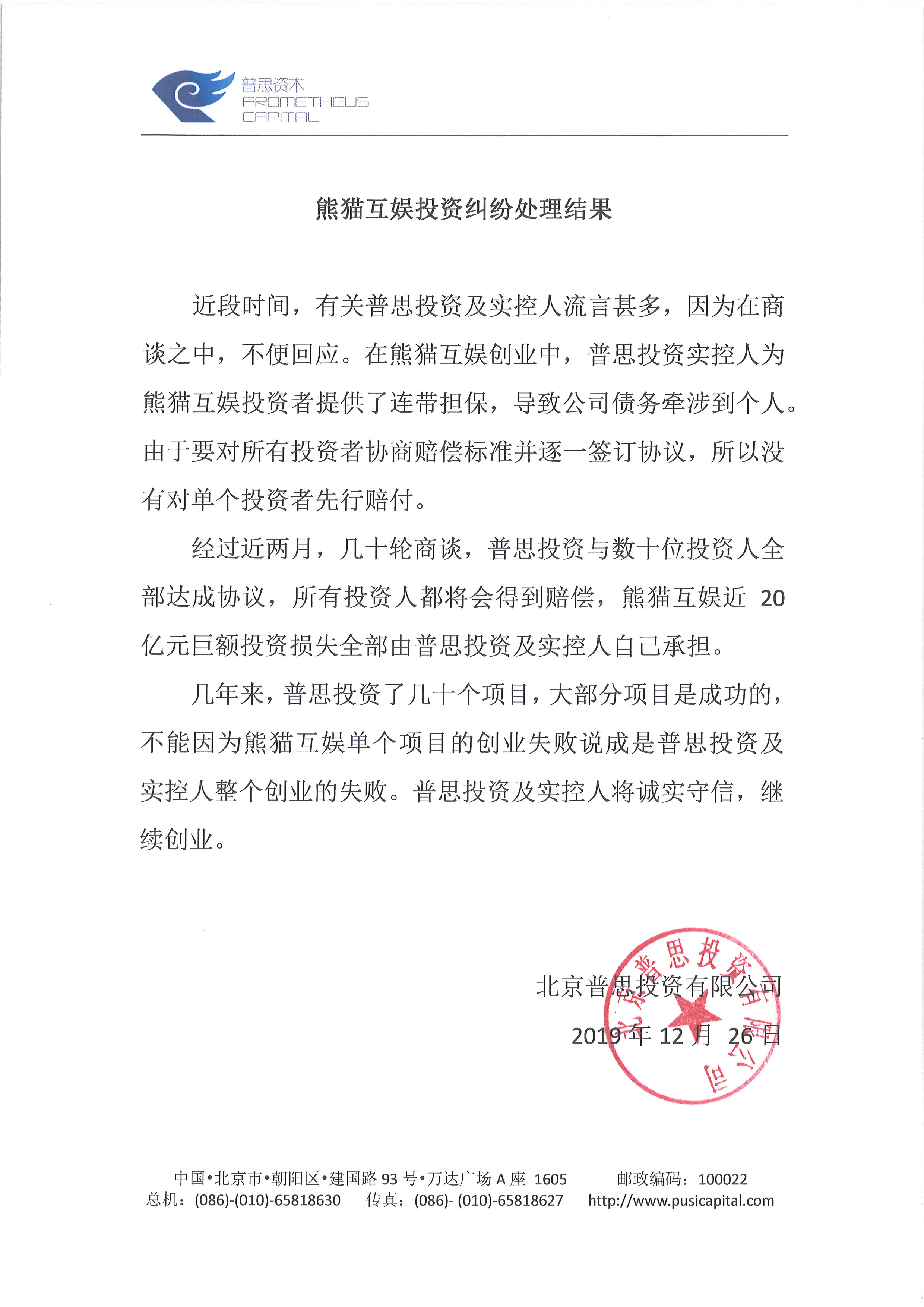 12月26日,普思资本发布声明披露熊猫互娱投资纠纷处理结果,称所有投资人都得到了赔偿。