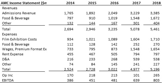 AMC是全球最大的电影院链,总部位于堪萨斯城。它在2018年在全球运营了1,006个地点,在美国占63%,在国际地点中占37%。AMC的两个主要收入途径为电影票房收入和食品、饮料售卖,分别占2018年总收入的62%和31%。费用则主要为电影放映费和租金。